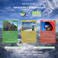 Vortragsreihe „Wandern & Bergsteigen 2026“ Eine Kooperationsveranstaltung der Kletterwelt Sauerland und der DAV Sektion Gummersbach Mit der Vortragsreihe „Wandern & Bergsteigen“ laden die Kletterwelt Sauerland und die DAV Sektion Gummersbach...