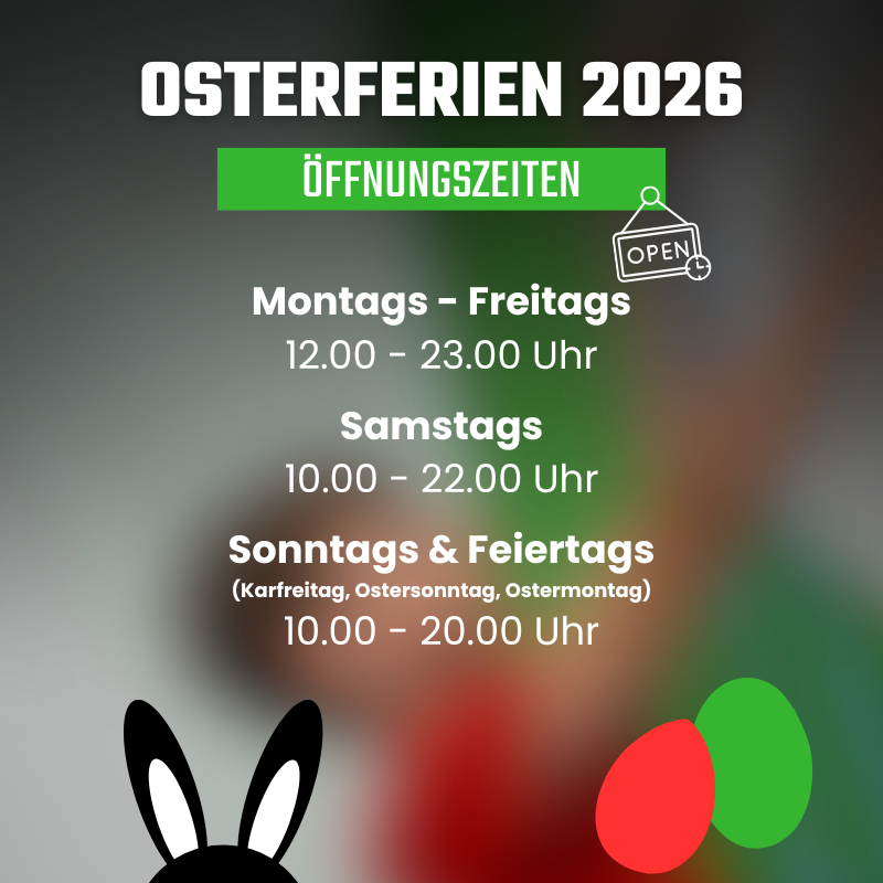 Öffnungszeiten in den Osterferien In den Osterferien vom 30. März bis 12. April 2026 ändern sich unsere Öffnungszeiten wie folgt: Montags – Freitags: 12 – 23 Uhr Samstags: 10 –...