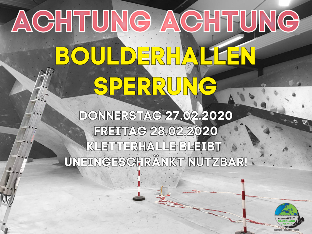 Aufgrund der Vorbereitungen für unseren Sauerland Bouldercup 2020 der am Samstag den 29.02. stattfindet ist die Boulderhalle am Donnerstag den 27.02. und Freitag den 28.02. gesperrt und nicht nutzbar. Die Kletterhalle ist durchgehen uneingeschränkt nutzbar, auch am Samstag während des Bouldercups! …also alle Boulderer die schon immer mal ans Seil wollten haben Donnerstag und Freitag […]
