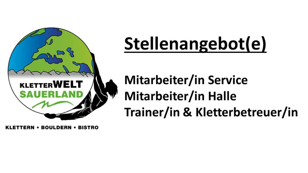 Zur Verstärkung unseres Teams suchen wir motivierte Hallenmitarbeiter/innen sowie Thekenkräfte die unser Team in der Kletterwelt Sauerland verstärken. Weitere Informationen könnt Ihr den beigefügten Stellenausschreibungen entnehmen. Stellenausschreibung Thekenkraft 24.09.2018 Stellenausschreibung Mitarbeiter Halle 24.09.2018 Wir freuen uns von Euch zu hören! Euer Team der Kletterwelt Sauerland