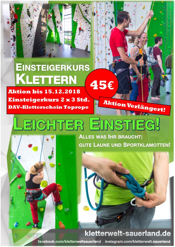 AKTION! AKTION! AKTION! Aufgrund der hohen Nachfrage nach unserem Einsteigerkursangebot verlängern wir die Aktion für Euch! Somit könnt ihr weiterhin noch bis zum 15.12.2018 für schlappe 45€ einen DAV zertifizierten Toprope-Schein à 2×3 Stunden absolvieren. Also ran mit Euch : Der perfekte Einstieg in eure persönliche Kletterkarriere. Keine Vorkenntnisse nötig! Alles was ihr braucht sind […]