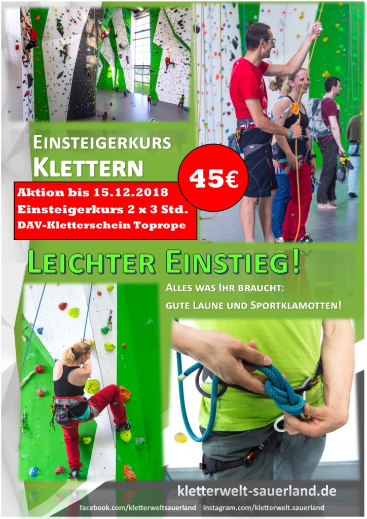 Einsteigerkurs – Toprope 2×3 Std. für 45€ noch bis 15.12. buchen, bis Ende Januar machen!