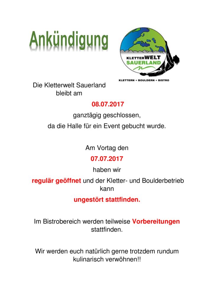 Die Kletterwelt Sauerland bleibt am Samstag den 08.07.2017 geschlossen!