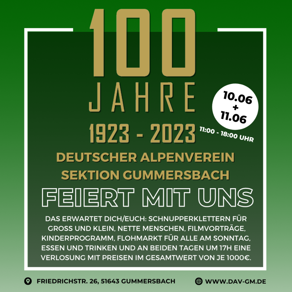 Unser Kooperationspartner feiert! Du bist herzlich eingeladen, 100 Jahre Deutscher Alpenverein Sektion Gummersbach zu feiern 10. + 11.06.2023 | 11:00 – 18:00 Uhr im Sektionsheim, Friedrichstraße 26 in 51643 Gummersbach Schnupperklettern für Groß und Klein nette Menschen Filmvorträge Kinderprogramm Flohmarkt am Sonntag lecker Essen und Trinken große Verlosung mit Preisen im Gesamtwert von bis zu […]