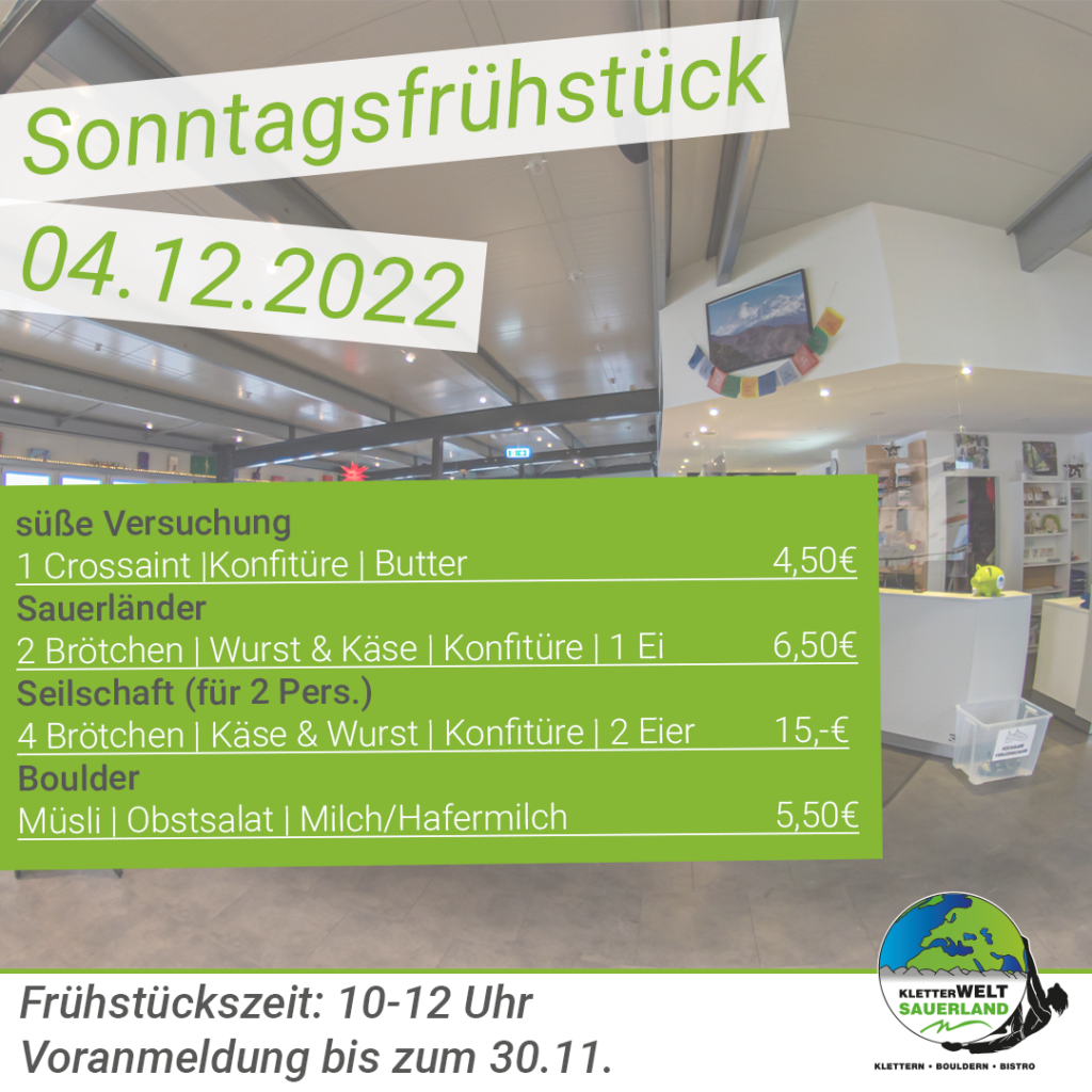 Du bist herzlich willkommen! Am 04.12. kannst du in der Kletterwelt Frühstücken. Wähle dein Lieblingsfrühstück und starte mit uns in den Tag. Für einen reibungslosen und entspannteren Ablauf melde dich schon jetzt bei uns bis zum 30.11. an. Wir freuen uns auf dich!