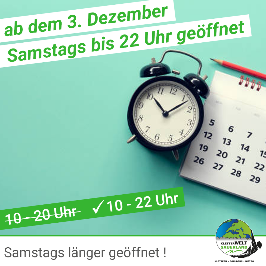 Ab Samstag, dem 03.12.2022 lassen wir unsere Türen am Wochenende wieder länger auf. Damit ihr die dunklen Wintertage mit Bewegung an der Wand ausfüllen könnt, sind wir jeden Samstag von 10-22 Uhr für euch da! Früher 10-20 Uhr –> JETZT 10- 22 Uhr!