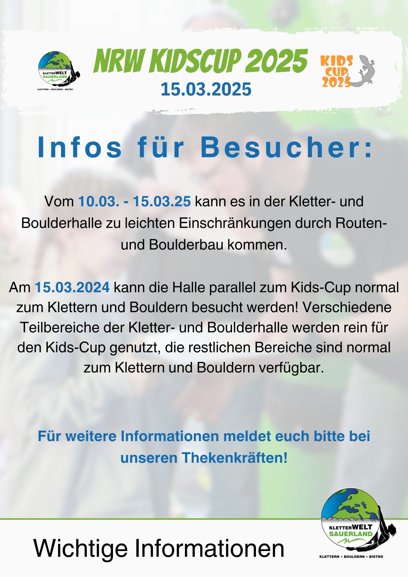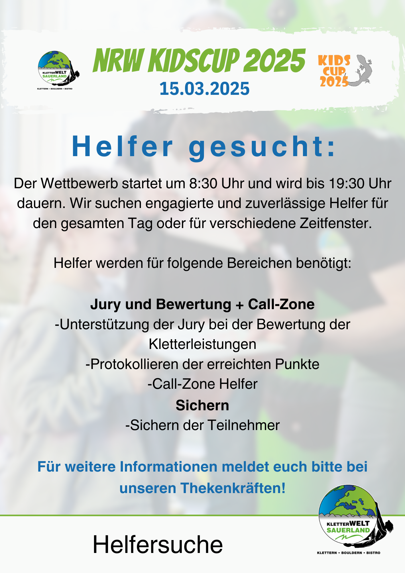 💡 Lust zu helfen? Melde dich bis zum 05.03.2025 per E-Mail an info@kletterwelt-sauerland.de oder direkt an unserer Theke!