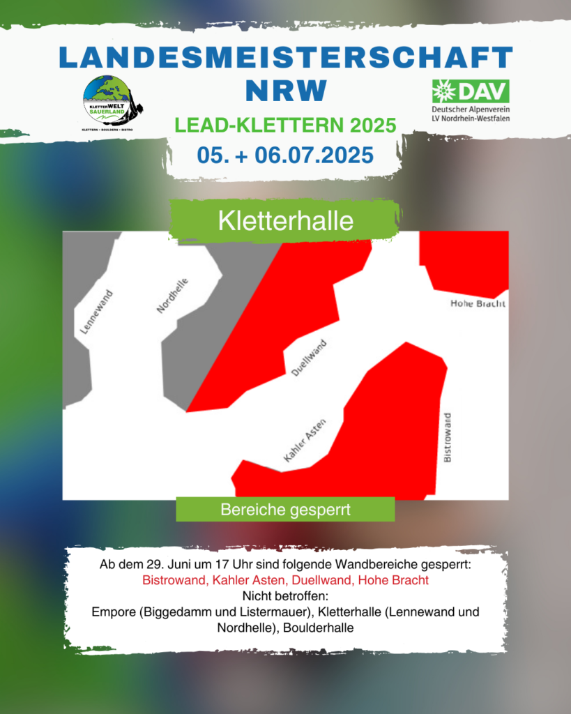 Wir holen die NRW Landesmeisterschaften 2025 ins Sauerland! Am 5. & 6. Juli klettern bei uns die Besten im Lande. Das ist natürlich mit viel Vorbereitung und leider auch Wandsperrungen verbunden.